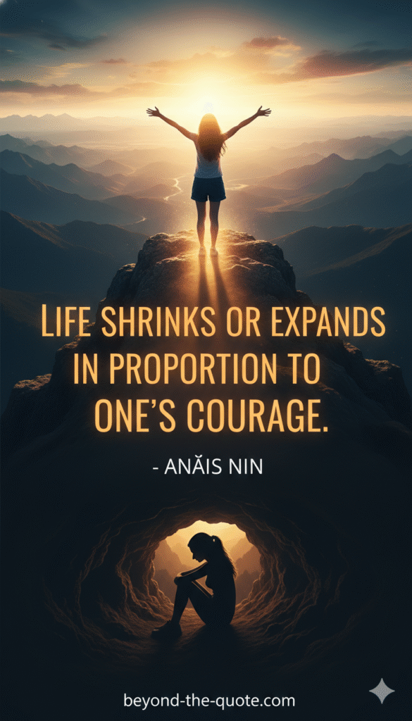 A lone woman stands triumphantly atop a sun-drenched mountain peak, arms outstretched, while another figure sits dejectedly in a cave below, symbolizing the quote "Life shrinks or expands in proportion to ONE's courage." by Anaïs Nin,